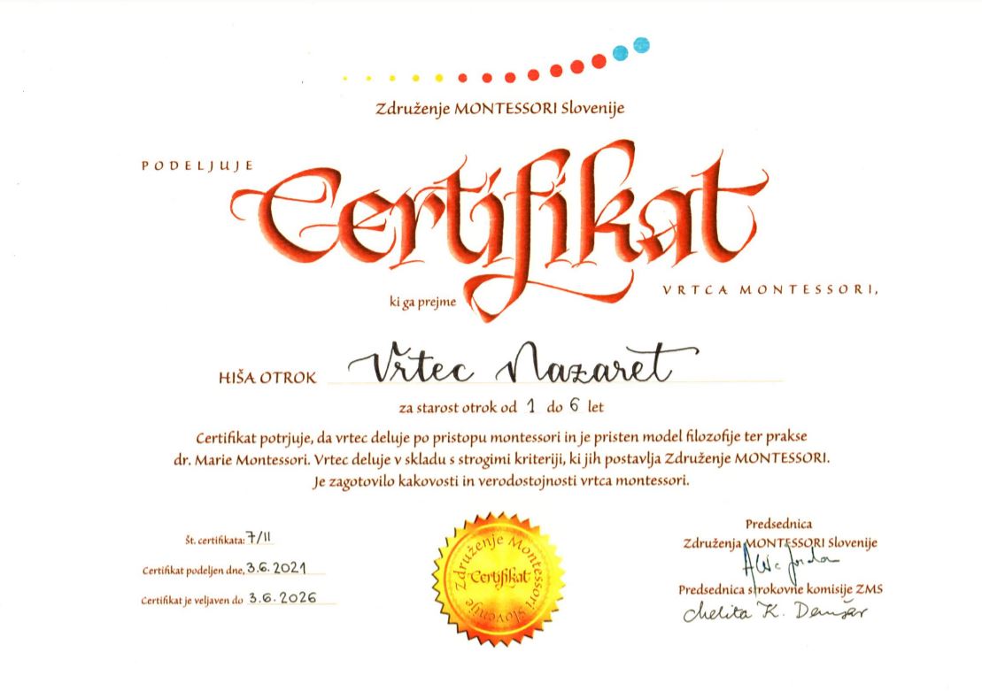 V Vrtcu Nazaret se veselimo, da smo prejeli certifikat Združenja MONTESSORI Slovenije za obdobje petih let, ki potrjuje verodostojnost in pristnost pristopa montessori.